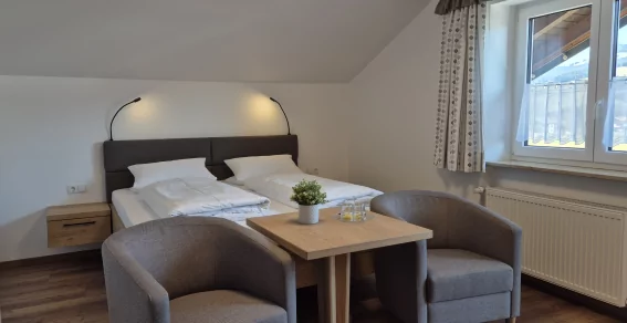 Das Doppelzimmer mit ca. 20m², liegt im EG mit Fenster Richtung Norden/ Parkplatz. Es ist ausgestattet mit DU/WC/Fön/Smart-TV, verstellbare Lattenroste und einer gemütlichen Sitzgruppe.
